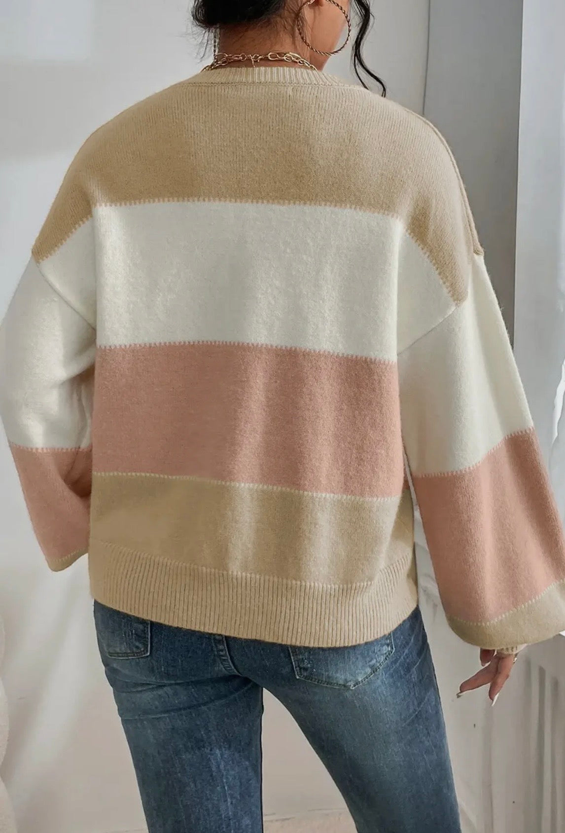 Soft, feminine, and effortlessly cozy — this dusty pink sweater is the perfect everyday piece for the season. With its lightweight knit and subtle colorblock stripes, it creates a flattering, relaxed look that’s easy to style for work, errands, or a casual weekend out.